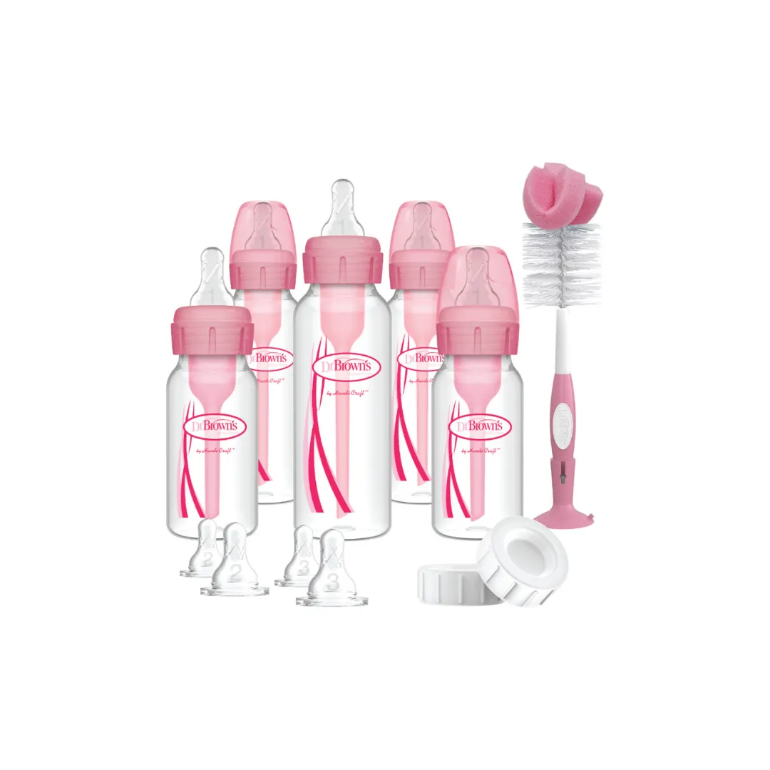 Además, el set trae un cepillo limpiador con base, dos tetinas adicionales de repuesto y tapas de almacenamiento para mayor practicidad. Fabricado con materiales libres de BPA, es una opción segura y confiable. Su delicado diseño rosado lo convierte en un regalo encantador, ideal para recién nacidas y perfecto para el día a día.