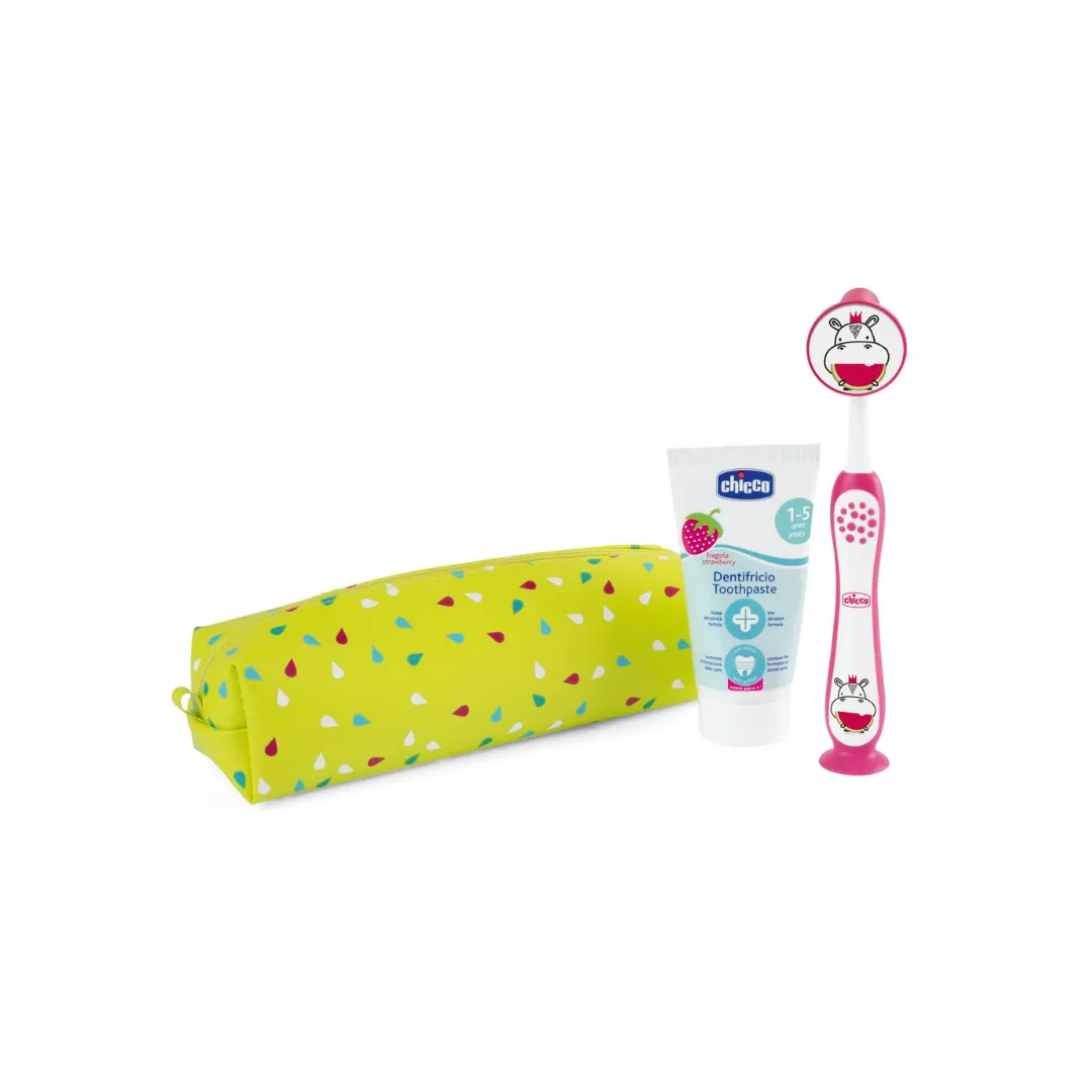 La pasta dental está especialmente formulada para niños de 1 a 5 años, con una baja abrasividad que protege el esmalte y ayuda a prevenir la formación de caries. El cepillo tiene cabezal pequeño y cerdas suaves, adaptadas a las encías delicadas, fomentando buenos hábitos desde temprano.