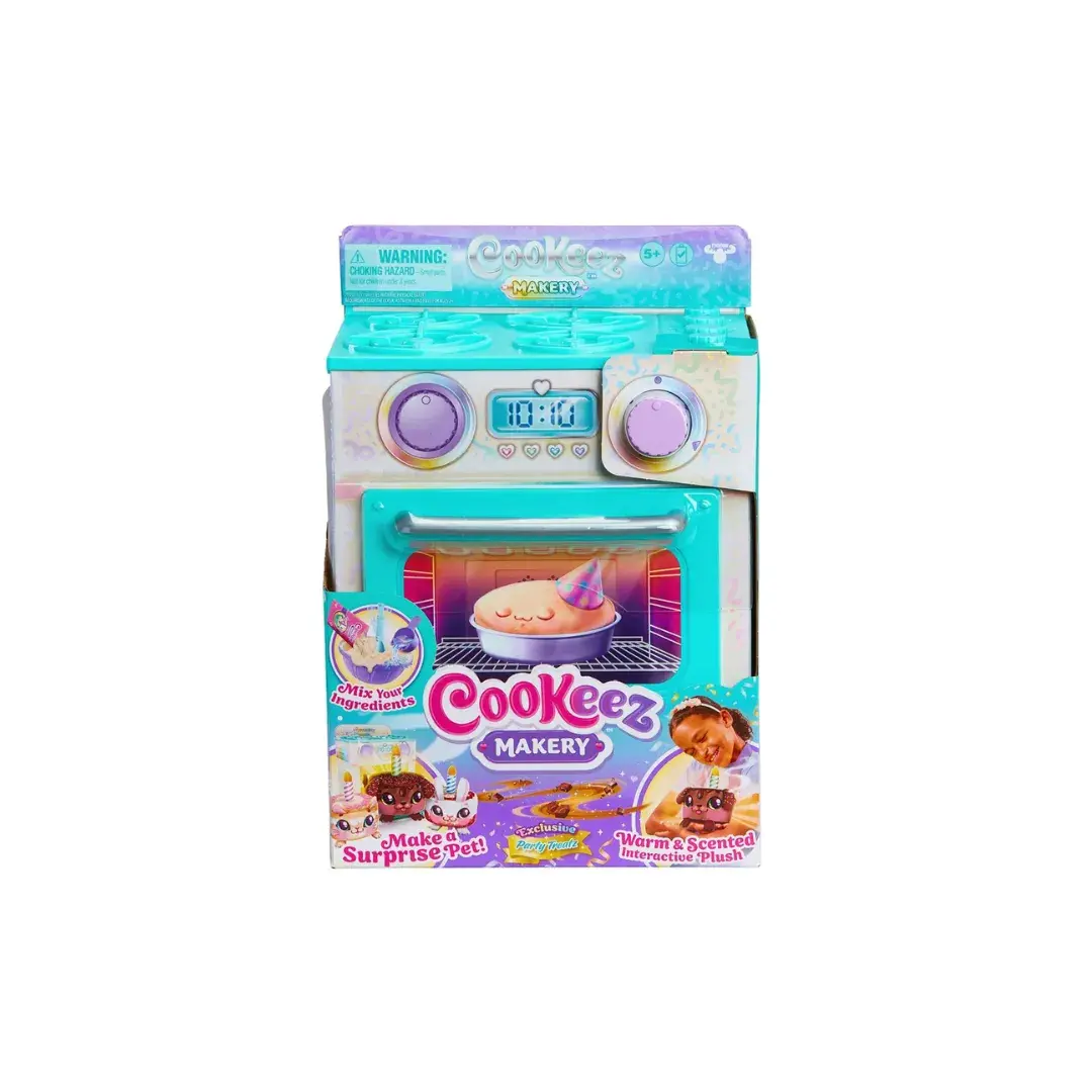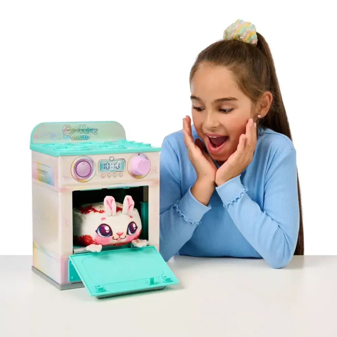 ¡El horno de golosinas para fiestas Cookeez Makery viene con todo lo que los niños necesitan para mezclar y hacer un horneado sorpresa! Cuando abran la puerta del horno por primera vez, encontrarán una caja de recetas y una tarjeta de recetas que les indica qué amigo hornearán. Existe la posibilidad de hacer un cachorro, un gatito o un conejo. ¡A cocinar! Primero, mezclan los ingredientes para crear una bola de masa. Luego, usando el molde de masa y las herramientas incluidas, pueden agregar características como ojos, boca, patas y orejas. ¡Es muy fácil! Luego, póngalo en el horno y cierre la puerta. En 90 segundos, los niños escucharán un «ding». Es hora de abrir el horno y conocer a un nuevo amigo. ¡Guau! Un juguete de peluche cálido y deliciosamente perfumado con canela con el que es interactivo jugar. Su nuevo amigo horneado incluso hace sonidos adorables cuando su hijo lo aprieta y le encanta. Con el horno Cookeez Makery, hornear nuevos amigos es fácil. ¿Qué Party Treatz prepararán? Hay 3 para crear: Red Velvet Bunny, Choc Fudge Fido y Strawberry Cateaux. Los niños pueden repetir el proceso una y otra vez para sorprender a la familia y los amigos. «Hornearás su día» cuando le des a tu hijo un horno Cookeez Makery – Party Treatz.