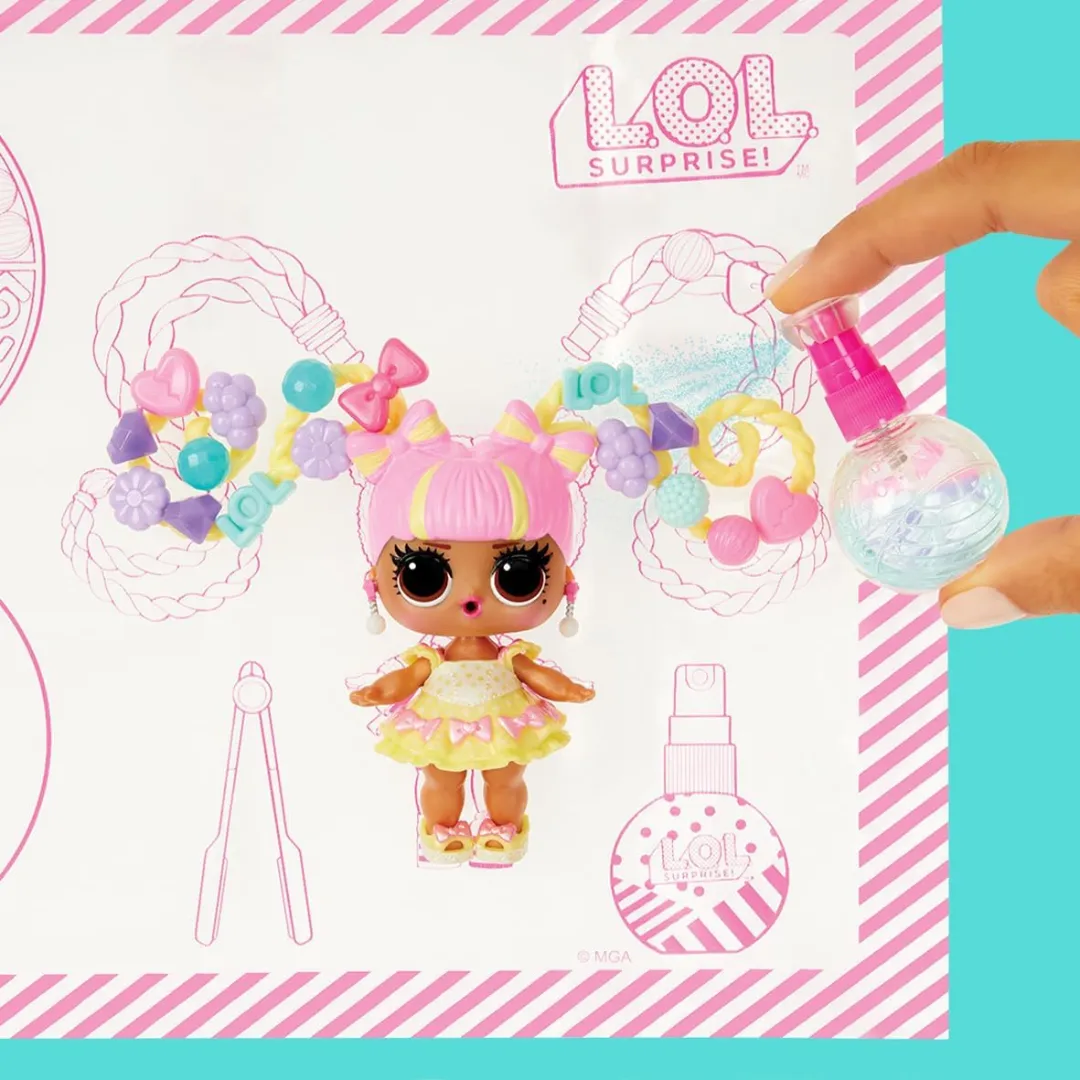 El set viene repleto de accesorios coloridos: trenzas, clips, peines, joyas y más para crear peinados únicos y lucir estilos originales. Además, su diseño se pliega y se convierte en un práctico maletín con asa, ideal para llevar la diversión a todas partes. ¡Deja que tu pequeña diseñadora de moda imagine, juegue y cree infinitos looks con este increíble centro de belleza LOL Surprise!