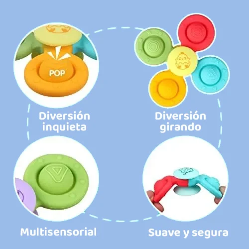 Elementos incluidos: 3 Juguetes spinner cada una con ventosa (Soft Baby)