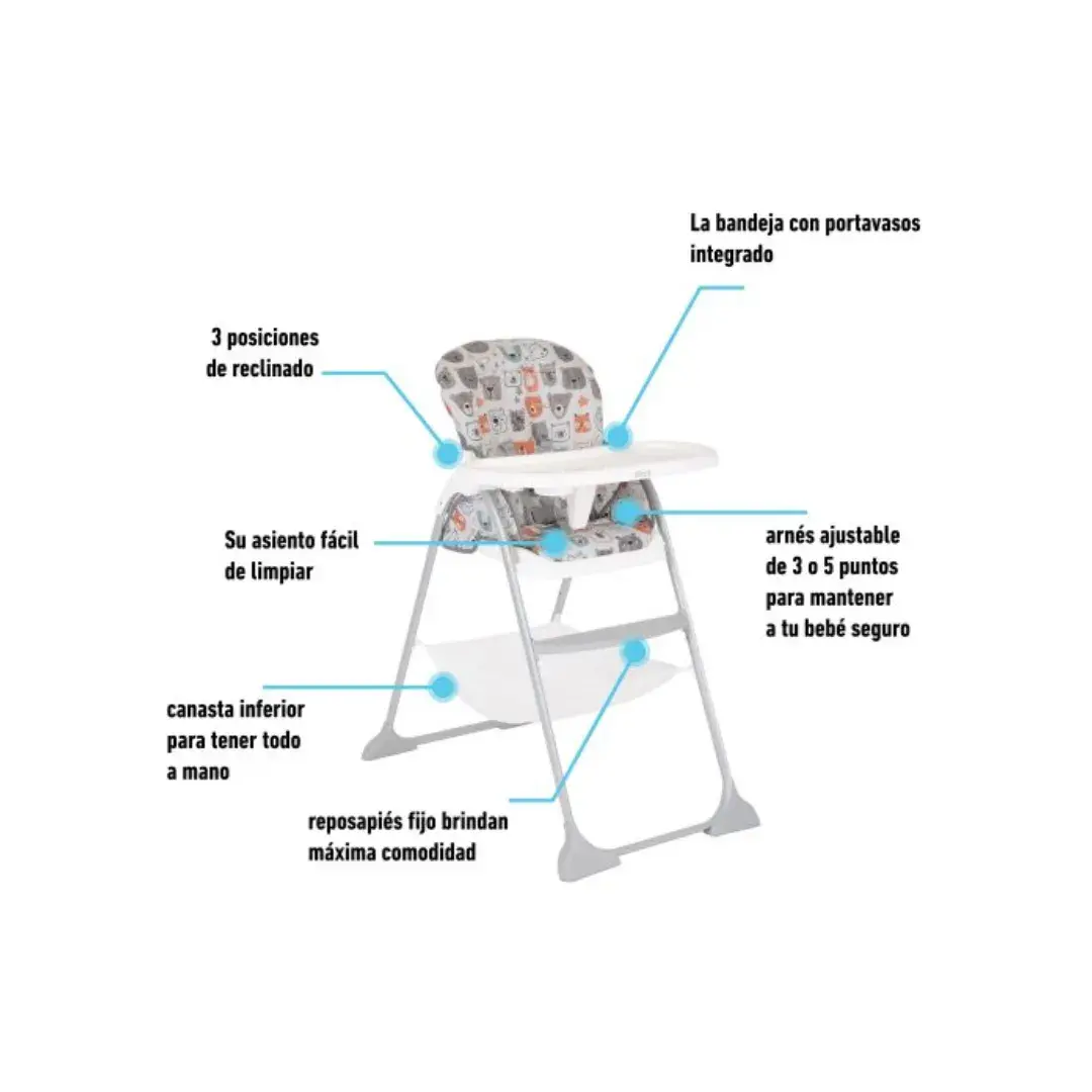 Ofrece un reclinado en 3 posiciones y un reposapiés fijo, lo que brinda comodidad y estabilidad durante las comidas.
