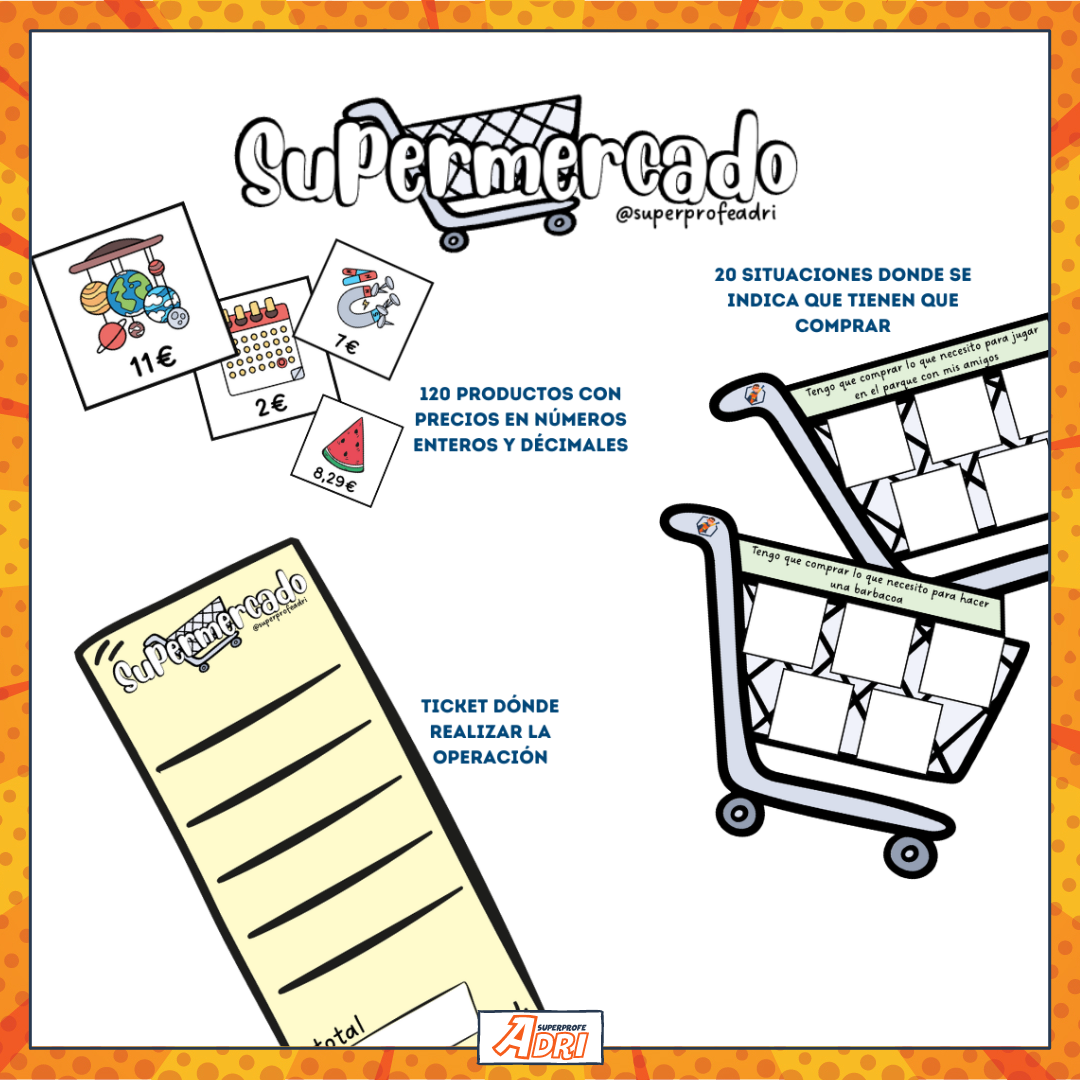 En este material llamado «EL SUPERMERCADO» les indicamos a los alumnos una serie de compras que tienen que realizar para una situación, después los alumnos deberán de seleccionar 5 PRODUCTOS y rellenar el ticket dónde realizarán la suma de los productos que han metido en su carro. Esta actividad la podemos completar dando a los alumnos unas monedas y billetes y que trabajen con ellos calculando lo que tienen que devolver, o dándoles un presupuesto y que se administren.