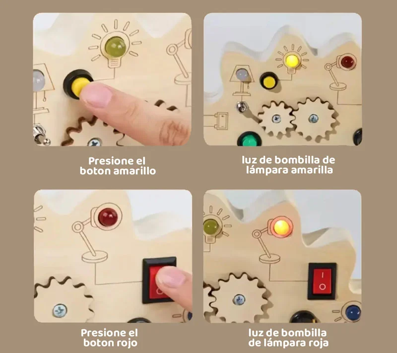 El Circuit Busy Board no es solo un juguete, es una herramienta educativa basada en el método Montessori. Sus interruptores, botones y luces invitan a los niños a explorar, apretar, girar y encender, fortaleciendo su coordinación ojo-mano y habilidades motoras finas mientras juegan.