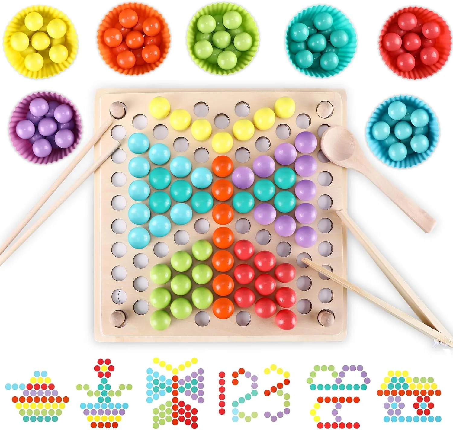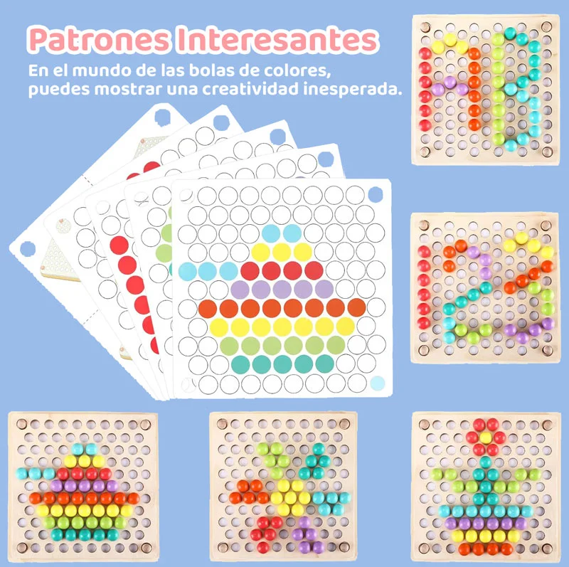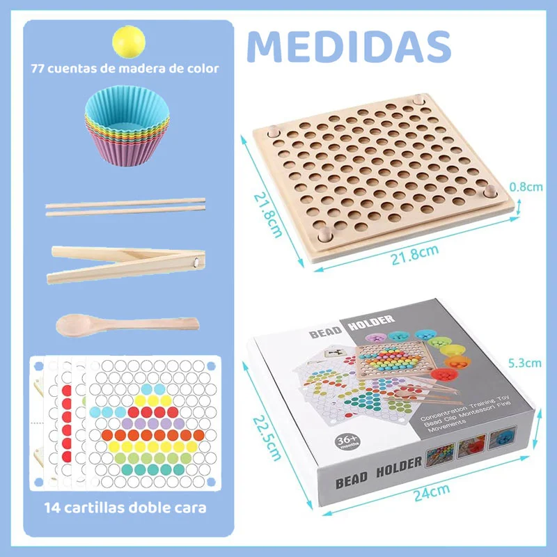 Incluye palillos, cucharas y pinzas para que los pequeños practiquen el uso de herramientas básicas. Al agarrar cuentas y colocarlas en su lugar, tu hijo desarrolla precisión, concentración y habilidades esenciales para la vida diaria.