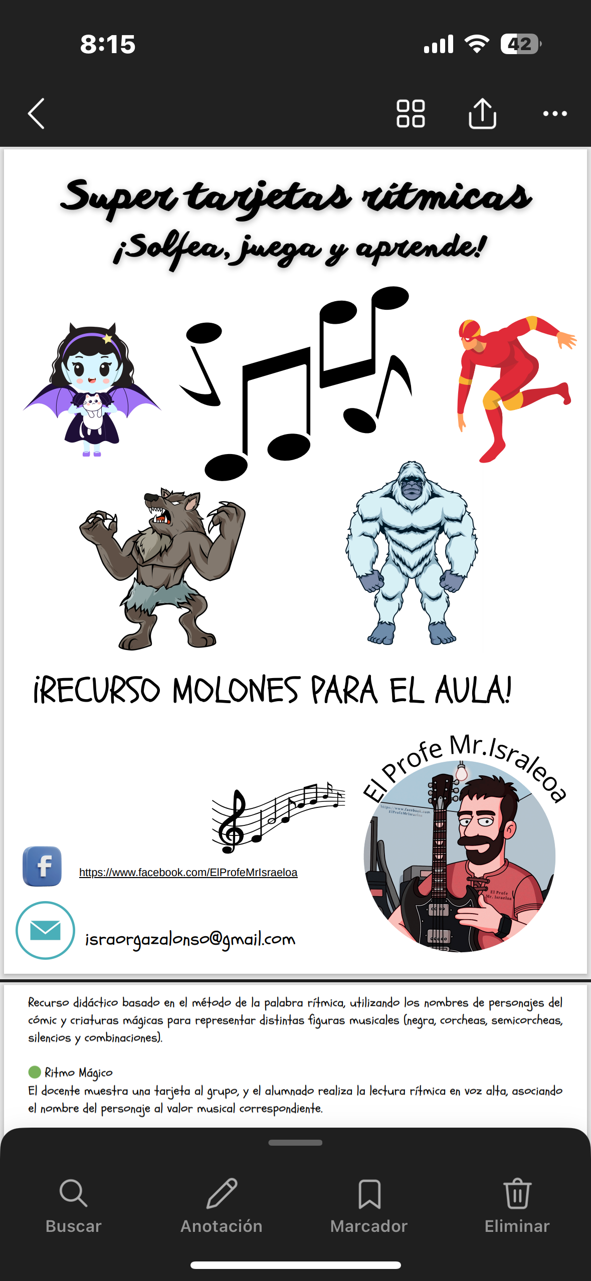El docente muestra una tarjeta al grupo, y el alumnado realiza la lectura rítmica en voz alta, asociando el nombre del personaje al valor musical correspondiente.