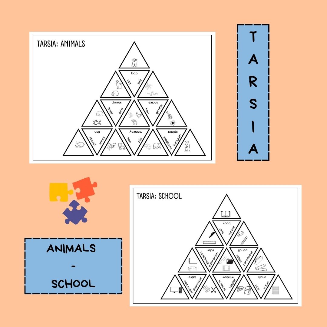 Esta actividad consiste en que el alumnado deberá unir las fichas del puzzle de forma que se corresponda imagen y palabra. Hay dos puzles, uno de animales y otro sobre objetos que encontramos en clase. Mediante este juego practican vocabulario al mismo tiempo que deben pensar y asociar cada imagen con su palabra correspondiente.