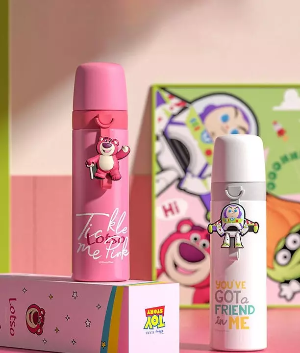 El tomatodo termo para bebé está diseñado con un cuerpo cilíndrico alto, colores sobresalientes según la imagen de los personajes de Buzz lightyear, Alien y Oso Lotso, con una etiqueta de silicona súper gruesa y encantadora.