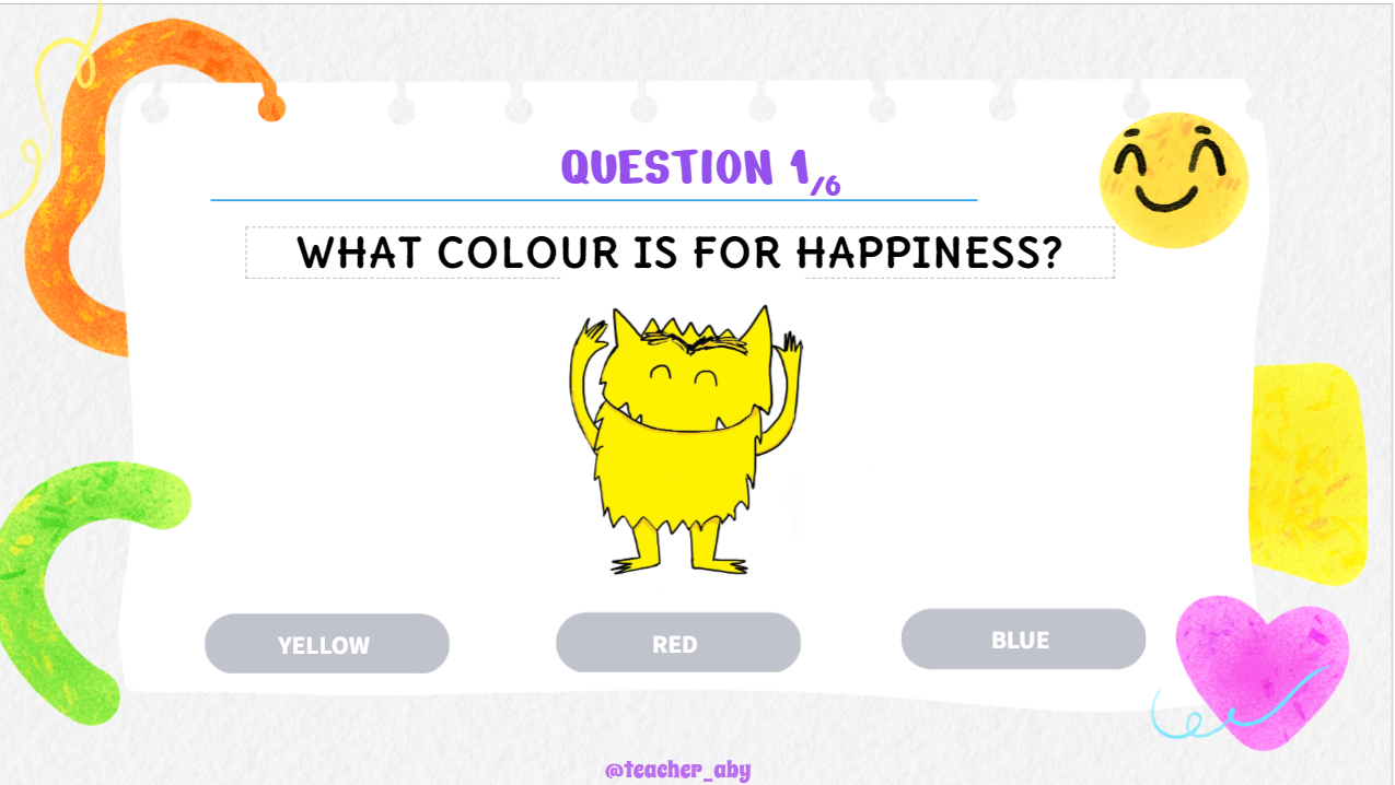 Se trata de elegir la opción correcta entre tres. Se pregunta sobre los colores del «monster» y sobre sus emociones. Un total de 6 preguntas, como los seis monstruos: happiness, anger, sadness, fear, love,calm.