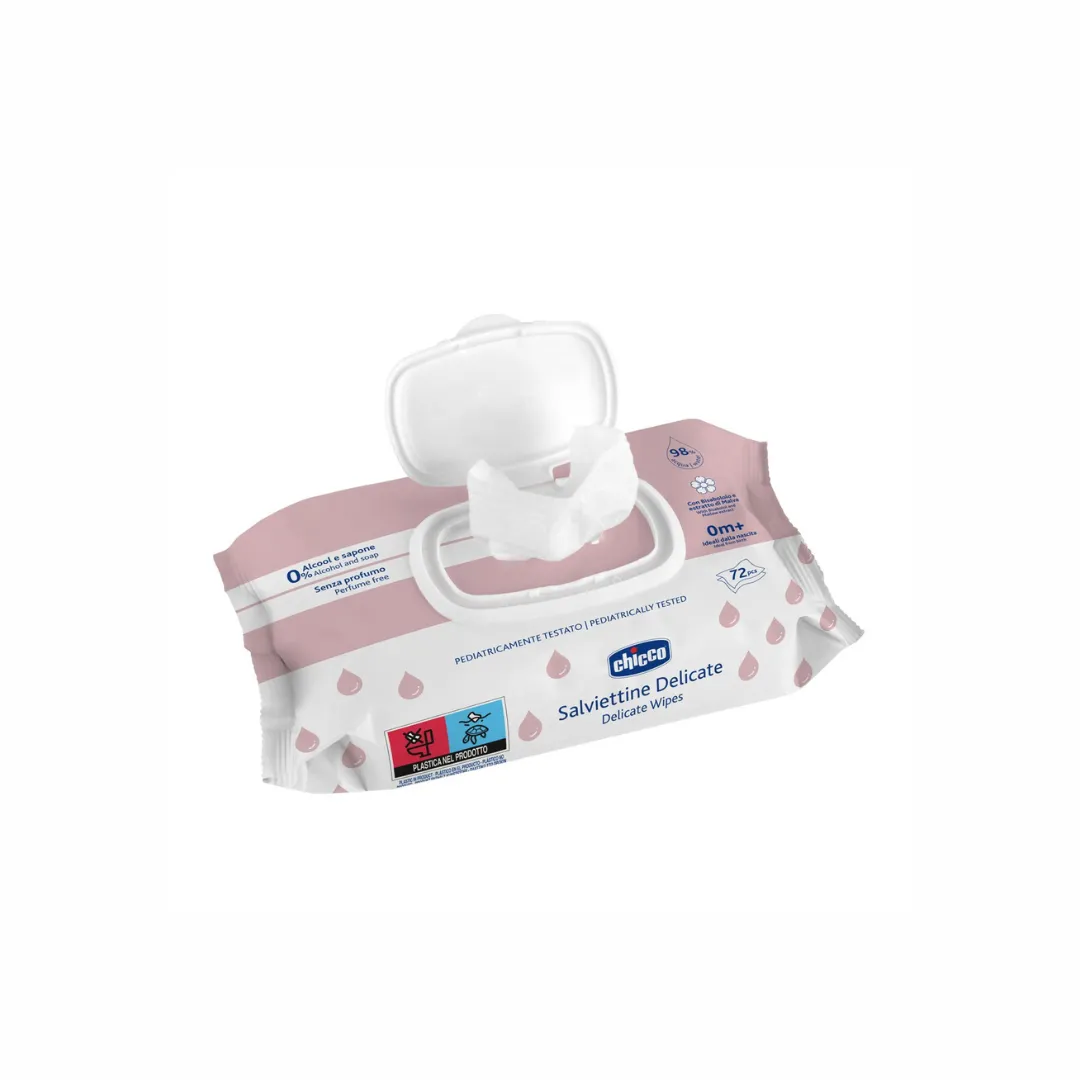 Las Toallitas Delicadas Chicco están diseñadas para la piel sensible del bebé – están formuladas sin alcohol ni jabón y sin fragancia, para limpiar con suavidad manos, cara y partes íntimas.