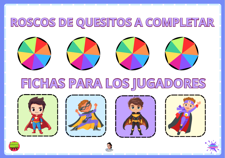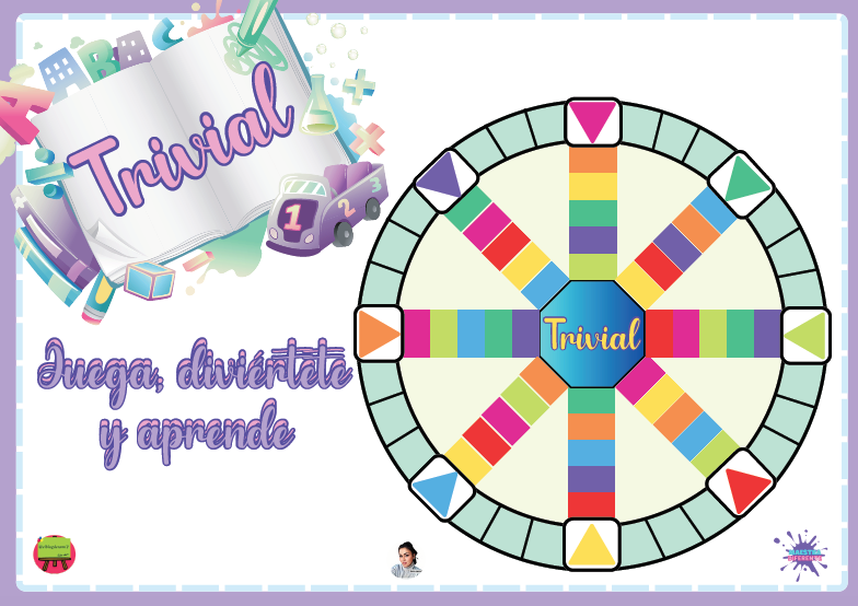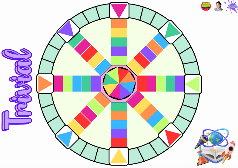 Trivial descargable donde los quesitos son Lengua, Cálculo, C. Sociales, C. Naturales, Ortografía, Preguntas trampa, adivinanzas y veo veo…