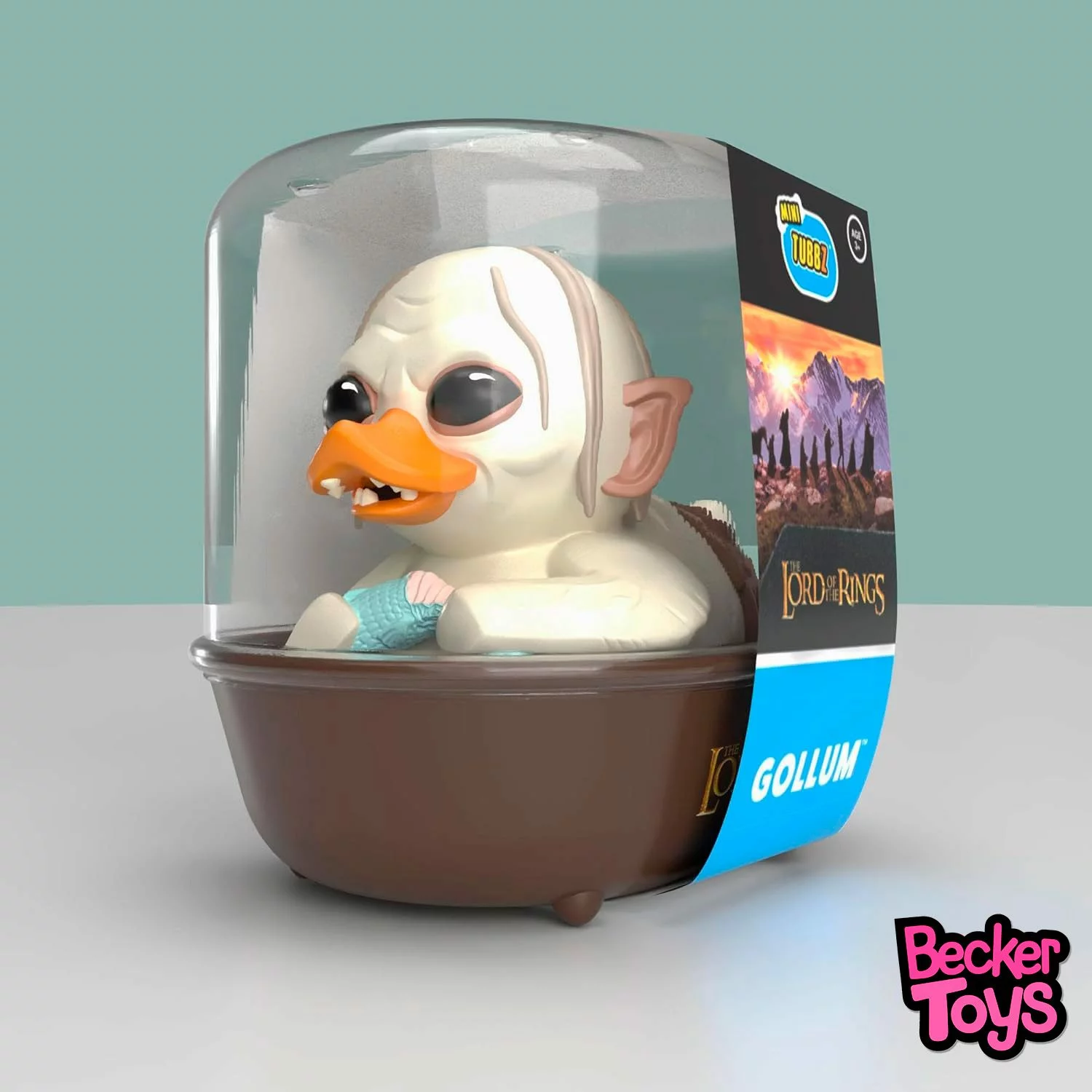 Esta edición mini representa a Gollum con su piel pálida, ojos grandes y expresión ansiosa, todo adaptado al cuerpo de pato. Sostiene un pez en las manos, evocando su vida en las cavernas y su dieta peculiar. El diseño conserva su melena escasa y orejas puntiagudas, y viene presentado en una bañera decorativa con el logotipo de The Lord of the Rings, típica de la colección TUBBZ.