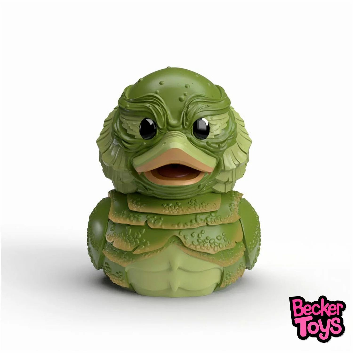 Esta edición mini presenta a la criatura con su piel escamosa verde, ojos saltones y branquias laterales, todo adaptado al cuerpo de pato. El diseño conserva los detalles clásicos del personaje, como las aletas dorsales y la expresión amenazante, pero con un toque adorable. Viene presentada en una mini bañera decorativa con el logotipo de Universal Monsters, ideal para vitrinas temáticas o escritorios.