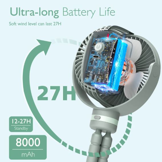 - Batería de duración ultralarga: Equipado con una batería de gran capacidad de 8000 mAh, el ventilador dura de 12 a 27 horas, dependiendo de la velocidad del viento. Incluye un cable de carga USB de 1 metro para cargarlo cómodamente en cualquier momento y lugar.
